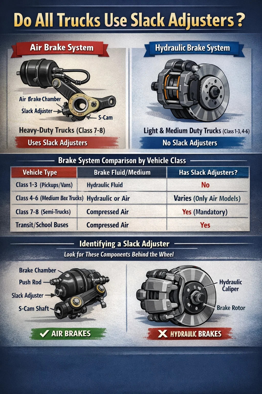 No, No todos los camiones tienen ajustadores de tensión. Que un camión esté equipado con estos componentes depende completamente de su sistema de frenos. Específicamente, ajustadores de holgura son una parte fundamental de los sistemas de frenos de aire que se encuentran en vehículos comerciales pesados (camiones Clase 7 y Clase 8). Las camionetas de servicio liviano, como las camionetas estándar (Clase 1-3), y muchas camionetas de carga mediana utilizan sistemas de frenado hidráulico, que no utilizan un mecanismo de ajuste de holgura para mantener la holgura de las zapatas o pastillas de freno.