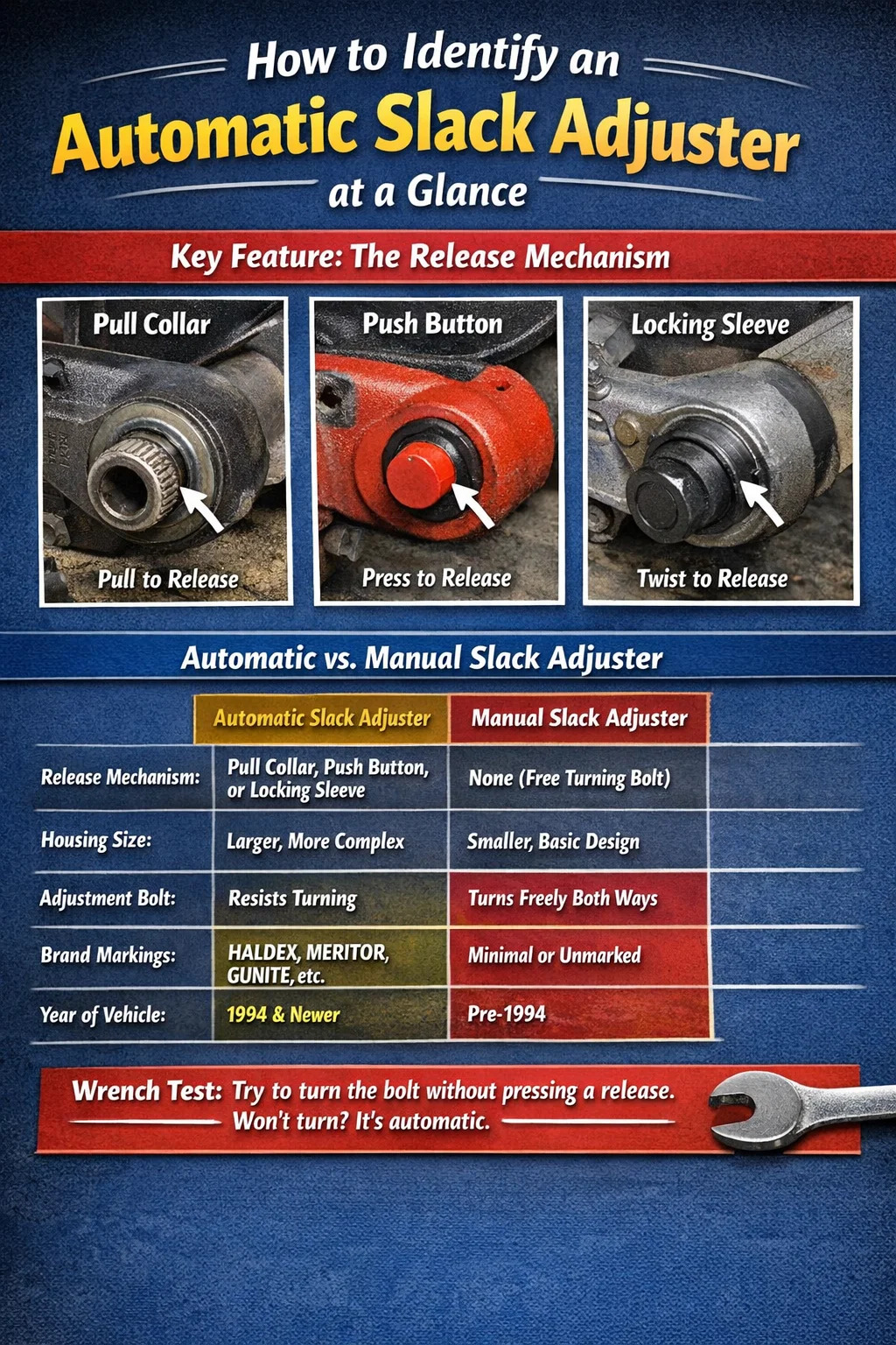 Los vehículos anteriores a 1994 (camiones rectos más antiguos de un solo eje, remolques antiguos y algunos autobuses de tránsito) todavía pueden funcionar con ajustadores manuales. El método de identificación difiere para estos, que se trata en una sección dedicada a continuación.