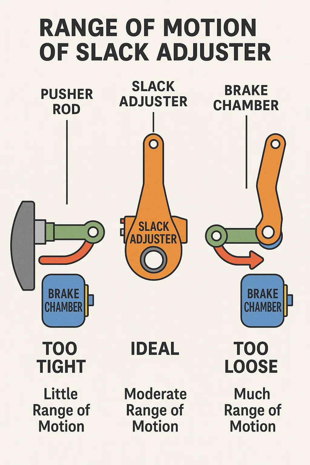 El "rango de movimiento", o más profesionalmente, la carrera del freno, se refiere a la distancia que se mueve el ajustador de tensión al tirar de la varilla de empuje durante la activación del sistema de frenos de aire.