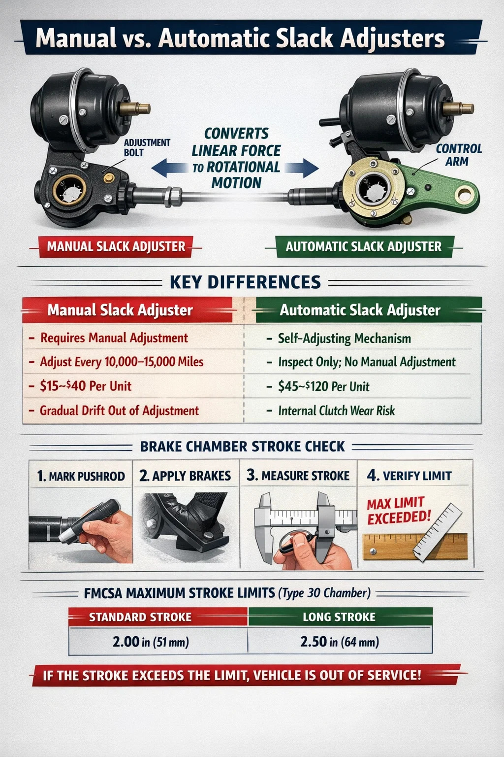 El punto crítico que muchos conductores no entienden: un ASA no elimina la necesidad de inspección. Elimina la necesidad de realizar ajustes manuales de rutina. Si un ASA se reajusta constantemente y aún no puede mantener la carrera dentro de los límites, eso es un síntoma de un revestimiento desgastado, un casquillo del árbol de levas atascado, un tambor de freno agrietado o un ajustador defectuoso; no es una señal de que el técnico simplemente necesite girar el perno de ajuste nuevamente.