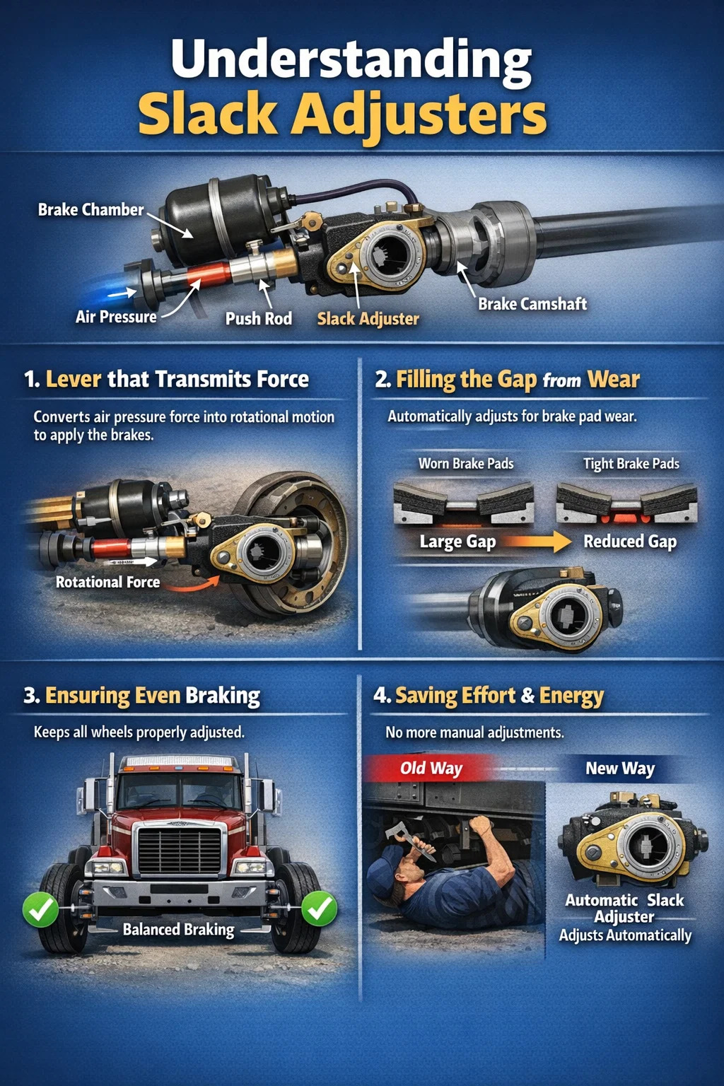 En el pasado, los conductores experimentados tenían que meterse con frecuencia debajo del vehículo y ajustar manualmente estos ajustadores con una llave para garantizar que los frenos funcionaran correctamente. Los ajustadores de tensión automáticos modernos son mucho más sofisticados. Pueden detectar si la holgura de freno es demasiado grande durante el frenado normal y ajustarla automáticamente en consecuencia.
