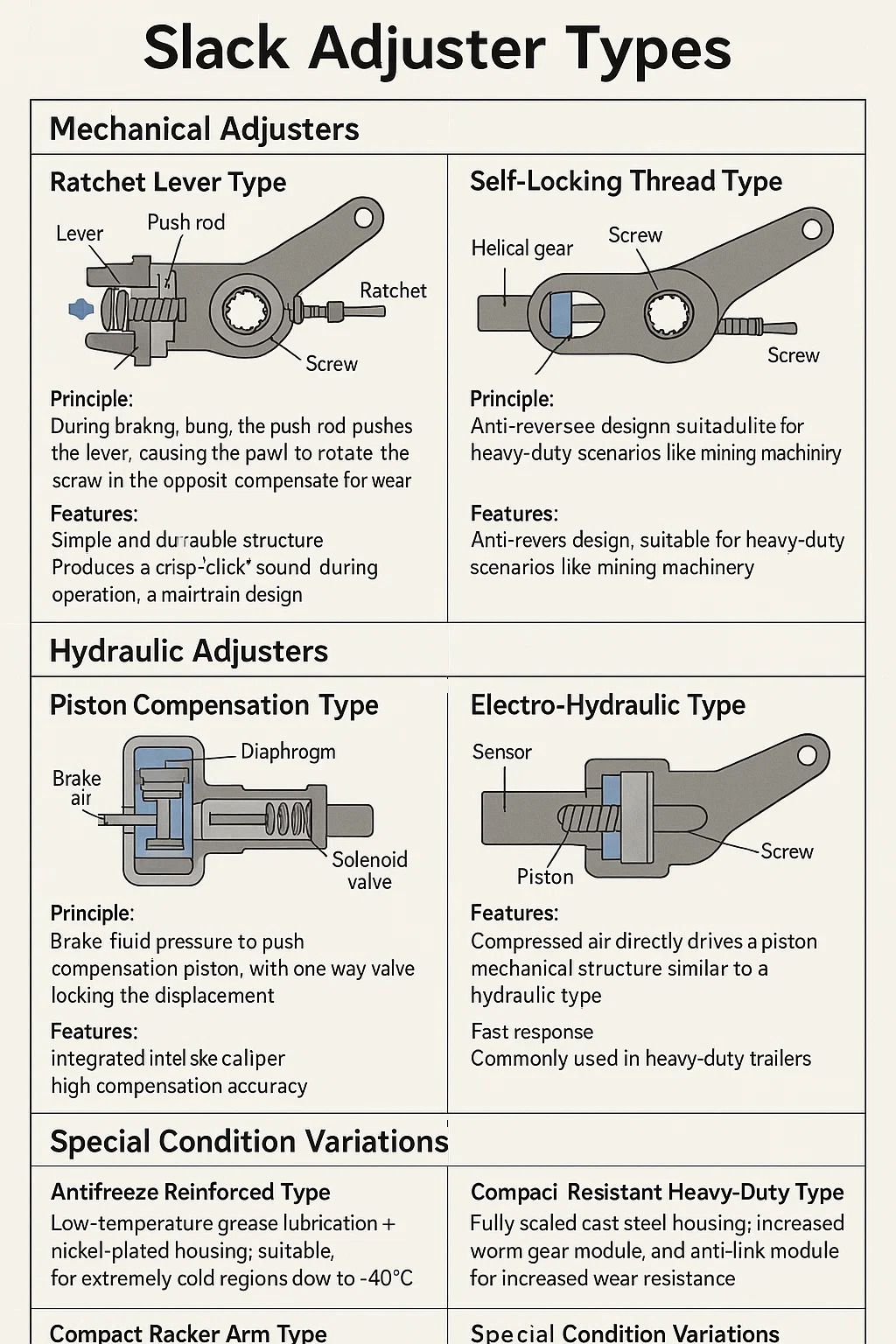 Principio: Durante el frenado, la varilla de empuje empuja la palanca, lo que hace que el trinquete gire el trinquete, lo que produce una ligera extensión del tornillo para compensar la holgura por desgaste.