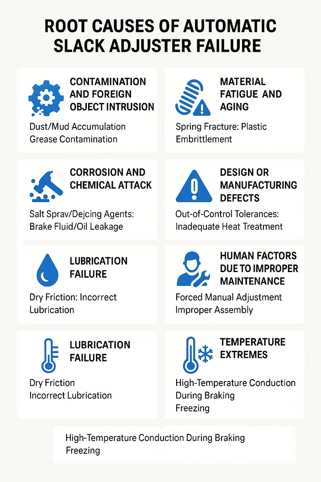 Conducción de alta temperatura durante el frenado: durante los largos descensos de cuesta abajo en áreas montañosas, el calor del tambor de freno se transfiere al ajustador, lo que provoca la carbonización de la grasa o el endurecimiento de las focas.