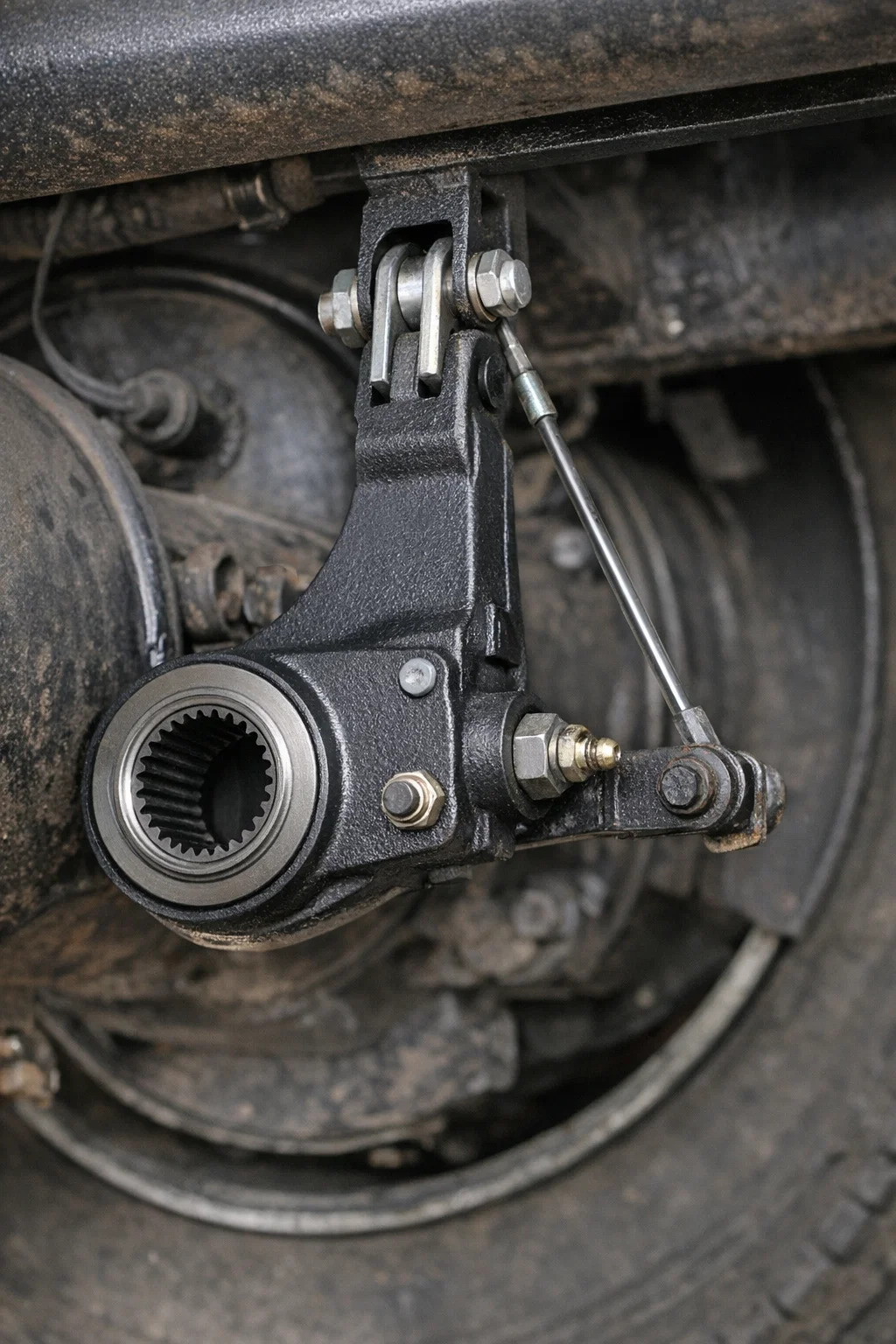 el ajustador de holgura automático Es como un "brazo de hierro" conectado al sistema de frenado de la rueda. Por lo general, está oculto detrás del eje en el interior de la rueda, pero si miras debajo del vehículo, se nota bastante.